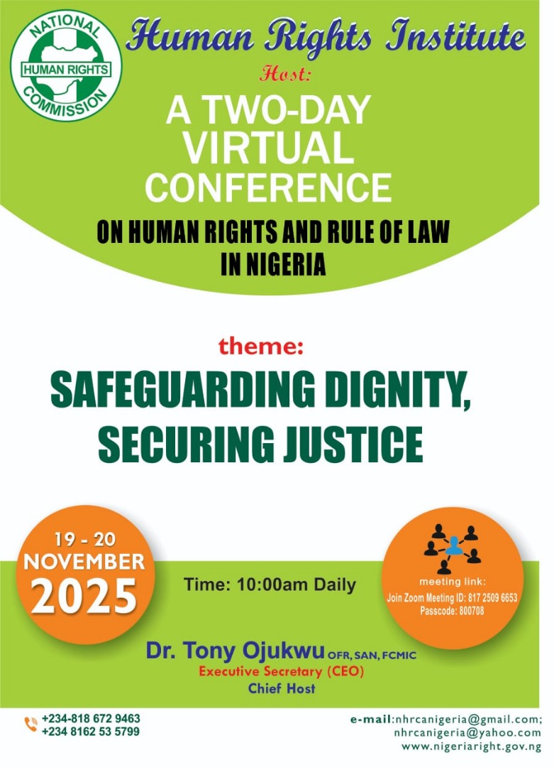 The Human Rights Institute (HRI) of the National Human Rights Commission (NHRC) is pleased to announce a two-day virtual conference on Human Rights and Rule of Law in Nigeria. The conference will bring together scholars, legal practitioners, policymakers, civil society, and law enforcement agencies to critically examine progress on human rights and rule of law, and to chart a path forward for safeguarding dignity and securing justice.