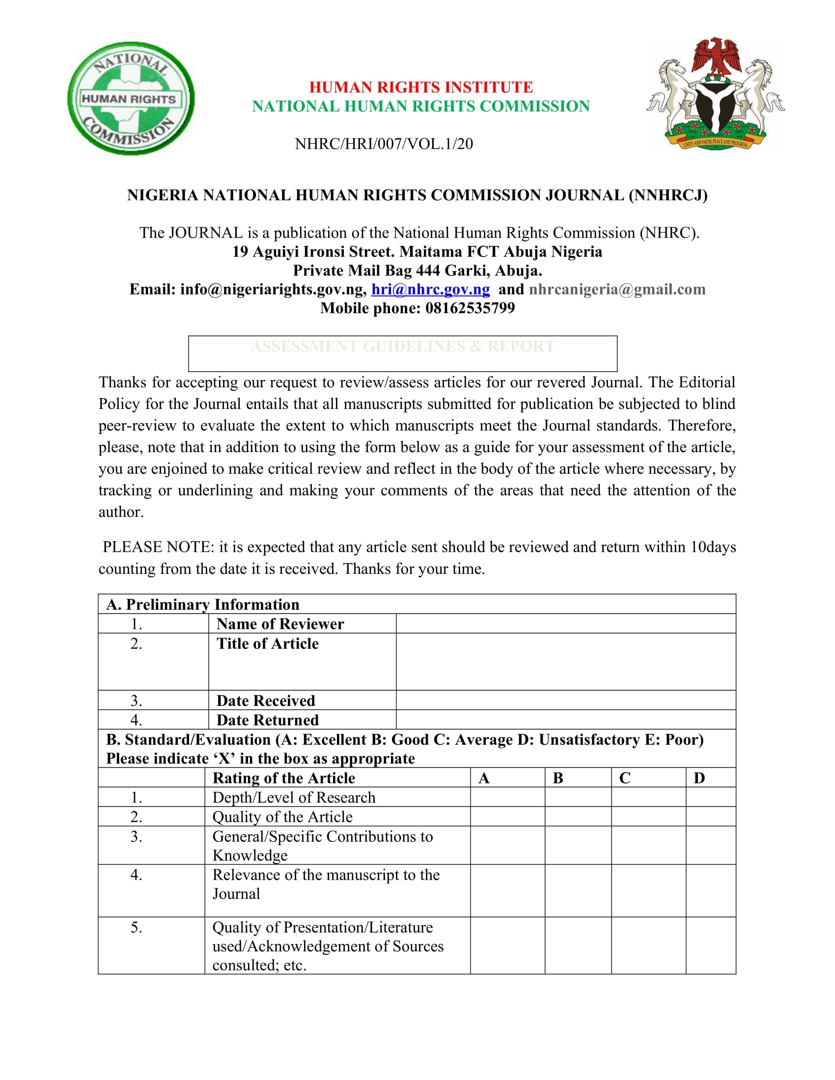 NIGERIA NATIONAL HUMAN RIGHTS COMMISSION JOURNAL (NNHRCJ) ASSESSMENT GUIDELINES & REPORT