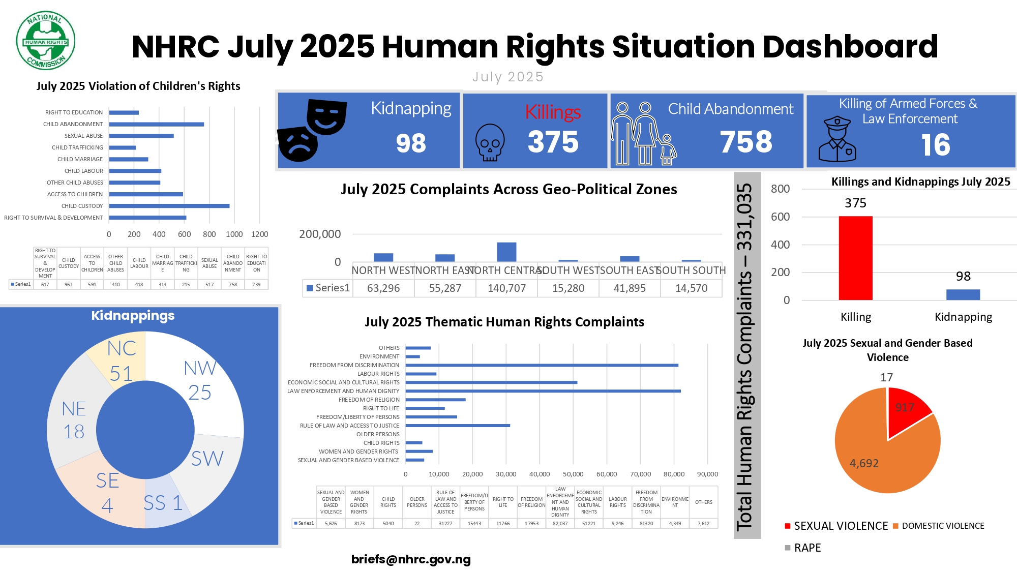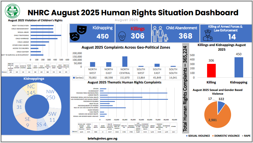 The National Human Rights Commission (NHRC) presents the August 2025 edition of its Human Rights Situation Dashboard, providing a comprehensive overview of human rights trends across the country. This month, the NHRC recorded 365,224 complaints (a 10% increase from June-July) highlighting critical issues such as law enforcement abuses, freedom from discrimination, economic social and cultural rights.